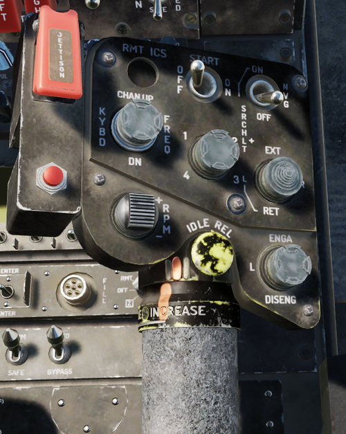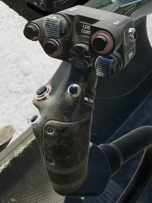 The Pilot Cyclic is primarily used for controlling the pitch and roll of the helicopter. The Cyclic Grip contains inputs for actioning weapons, making trim inputs and selecting MFD pages.