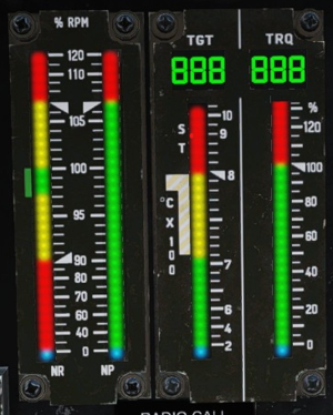 The Vertical Scale Instruments (which includes the TGT/TRQ Dual Indicator) are lighted displays found on the Pilot Instruments side of the main dashboard. From left to right they display NR (Relative Rotor RPM), NP (Relative Engine Power), Turbine Gas Temperature and Torque. Two digital displays show the Turbine Gas Temperature and Torque values.