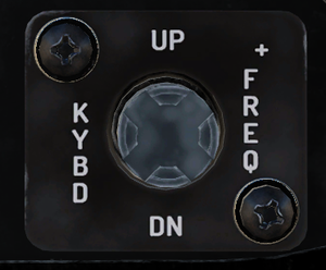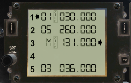 Pressing straight down on 5 (center position) selects FM-2 Pressing to the 2 (upper right) selects UHF Pressing to the 3 (lower right) selects VHF Pressing to the 4 (lower left) SATCOM, if installed (not implemented in DCS),